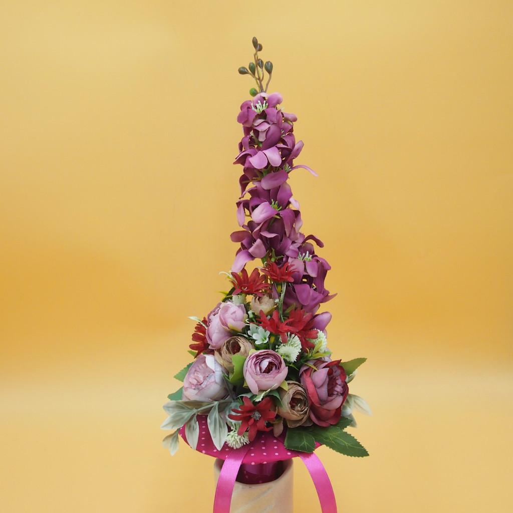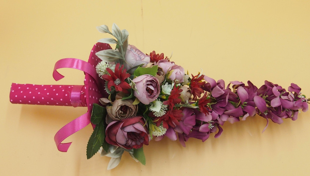 Selyem és mű virágokból. Kb. 40cm hosszúak összesen, ebből kb. 28cm a virágos rész, átmérőjük kb. 15cm.