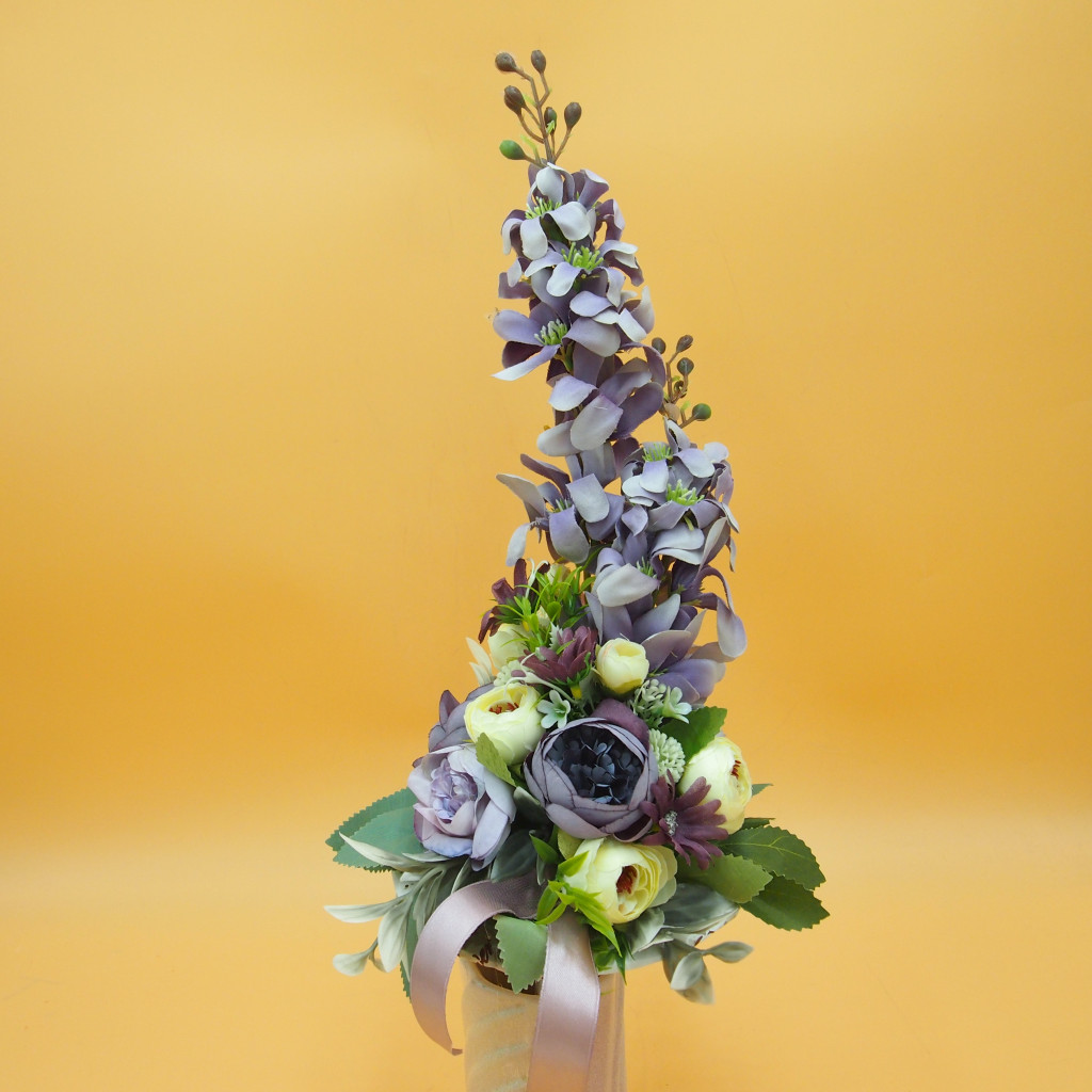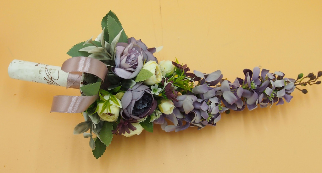 Selyem és mű virágokból. Kb. 40cm hosszúak összesen, ebből kb. 28cm a virágos rész, átmérőjük kb. 15cm.