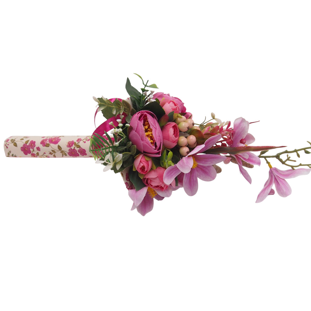 Selyem és mű virágokból. Kb. 45cm hosszúak összesen, ebből kb. 28cm a virágos rész, átmérőjük kb. 15cm.