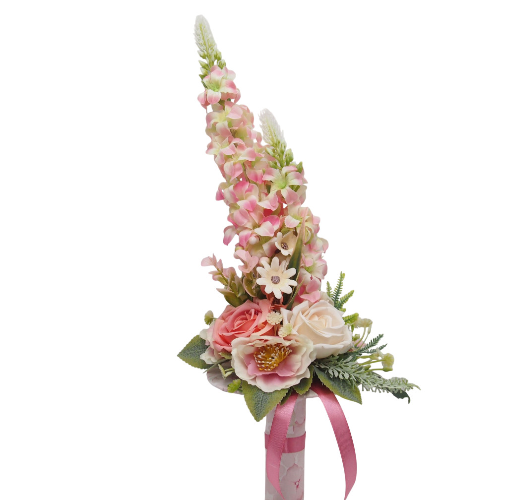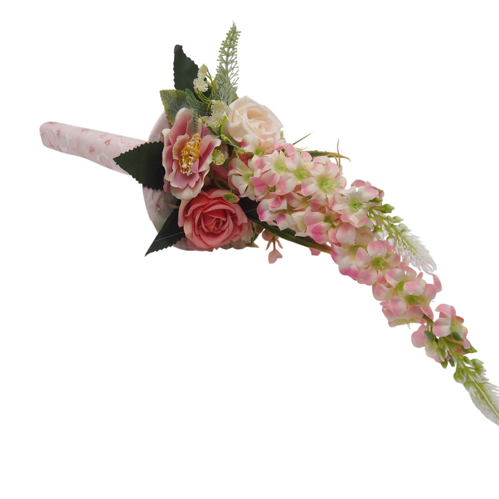 Selyem és mű virágokból. Kb. 45cm hosszúak összesen, ebből kb. 28cm a virágos rész, átmérőjük kb. 15cm.
