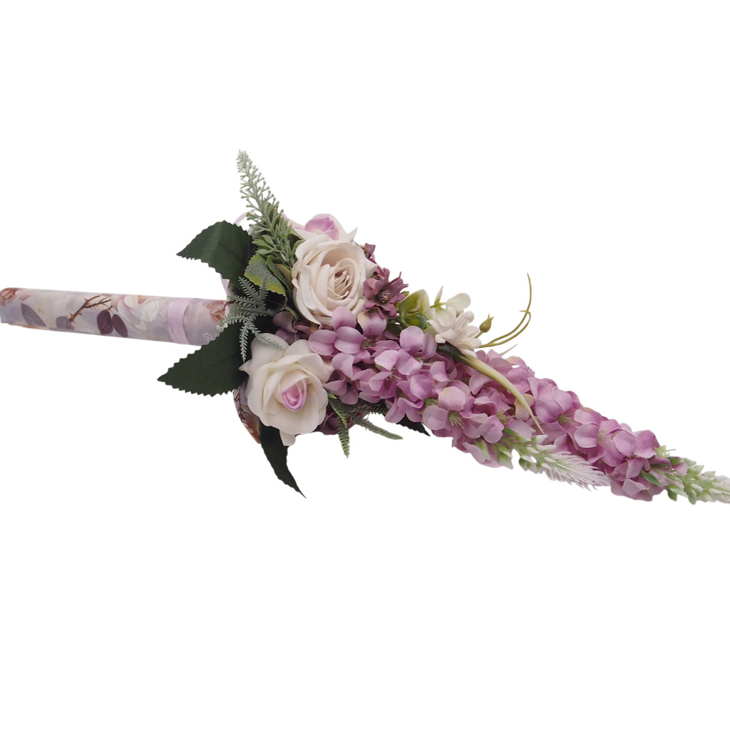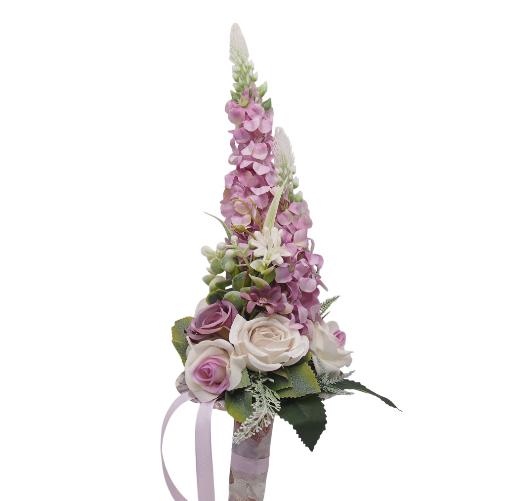 Selyem és mű virágokból. Kb. 45cm hosszúak összesen, ebből kb. 28cm a virágos rész, átmérőjük kb. 15cm.