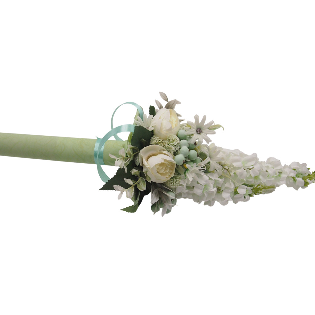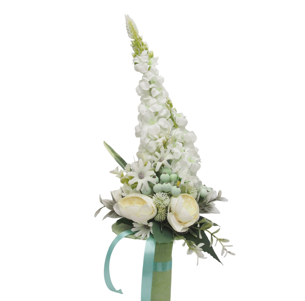 Selyem és mű virágokból. Kb. 45cm hosszúak összesen, ebből kb. 28cm a virágos rész, átmérőjük kb. 15cm.