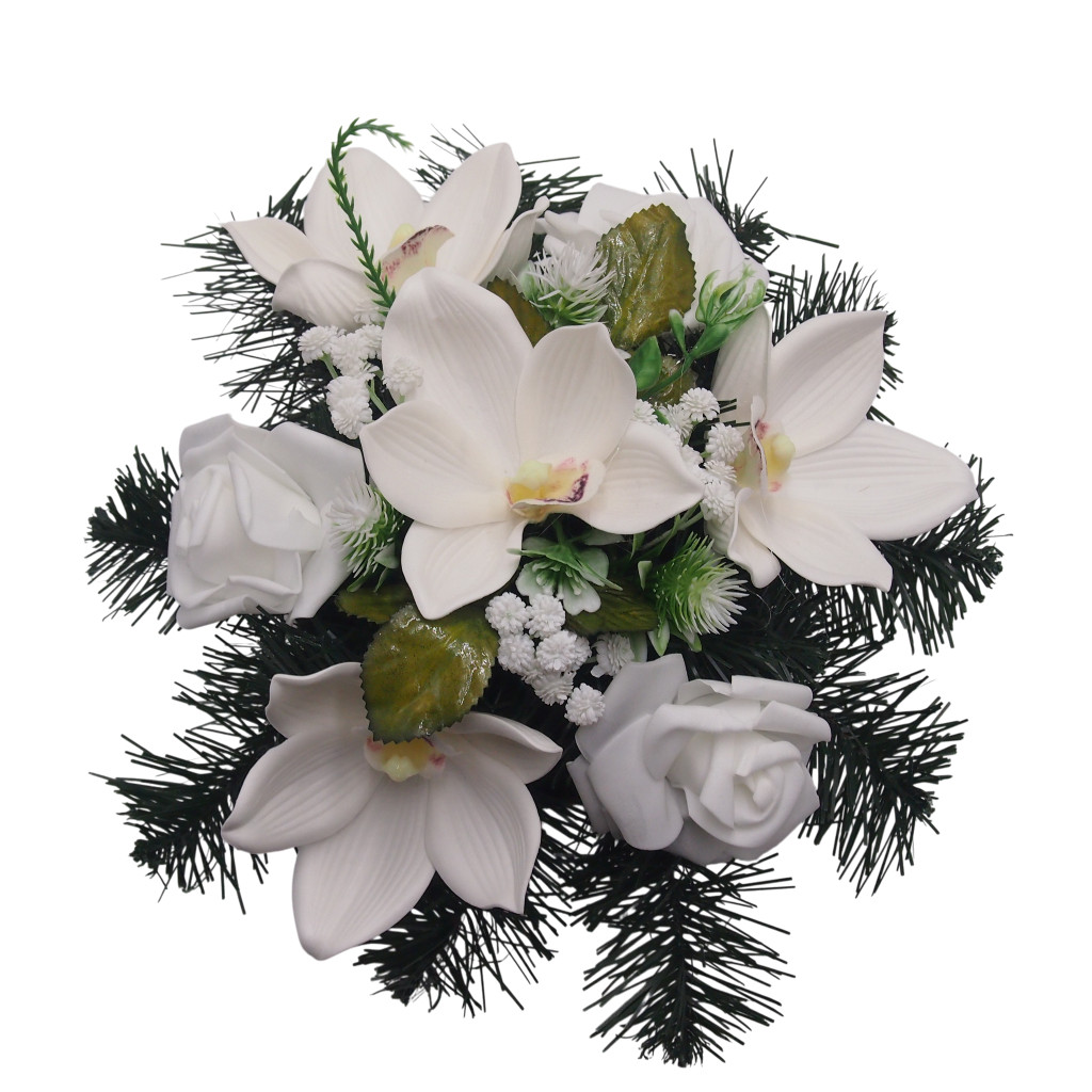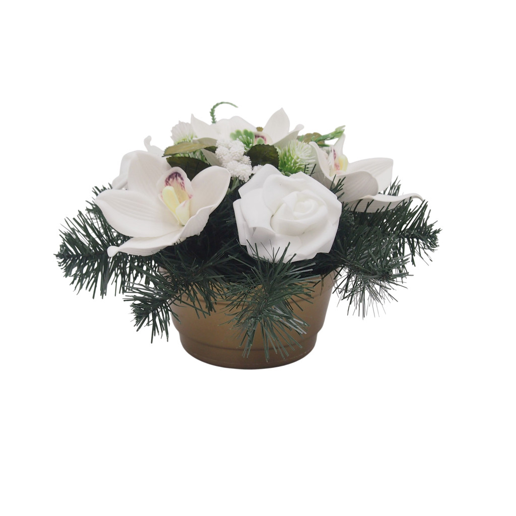 Selyemvirágok száraz oázisba tűzdelve, alatta beton nehezéknek, mű tálban.