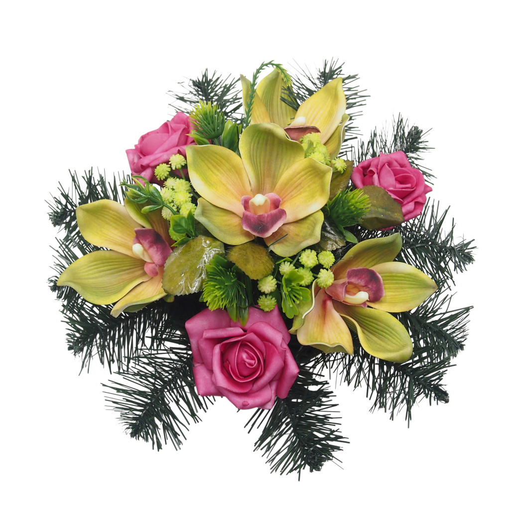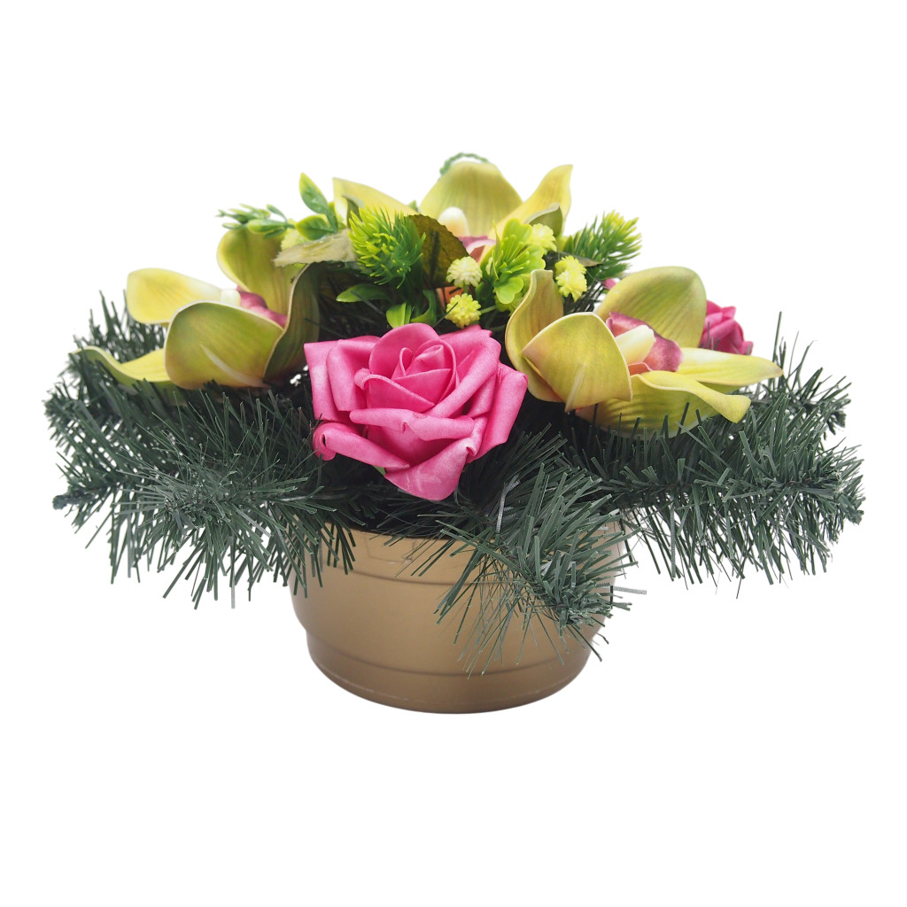 Selyemvirágok száraz oázisba tűzdelve, alatta beton nehezéknek, mű tálban.