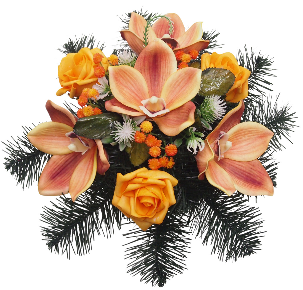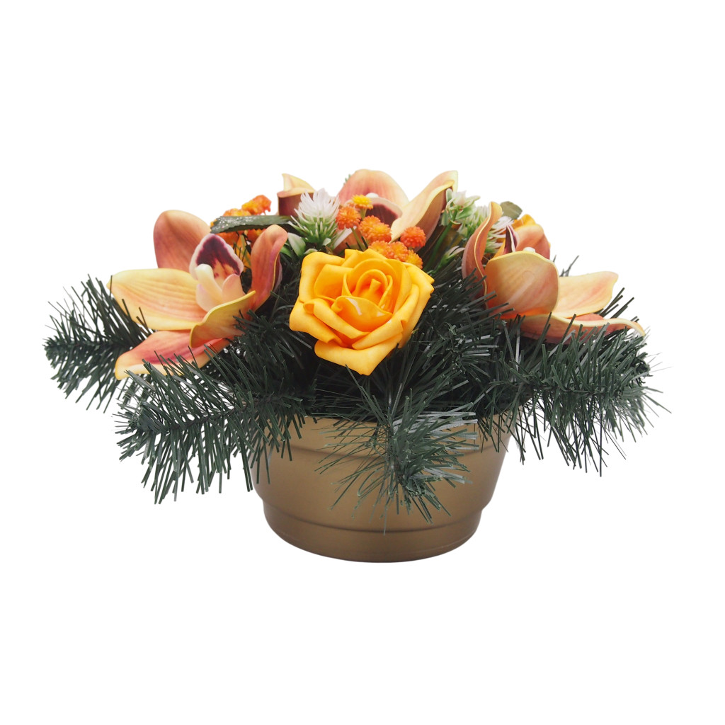 Selyemvirágok száraz oázisba tűzdelve, alatta beton nehezéknek, mű tálban.