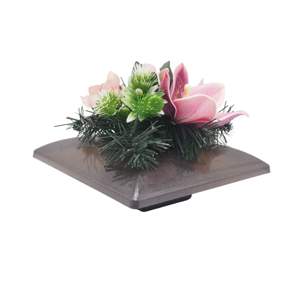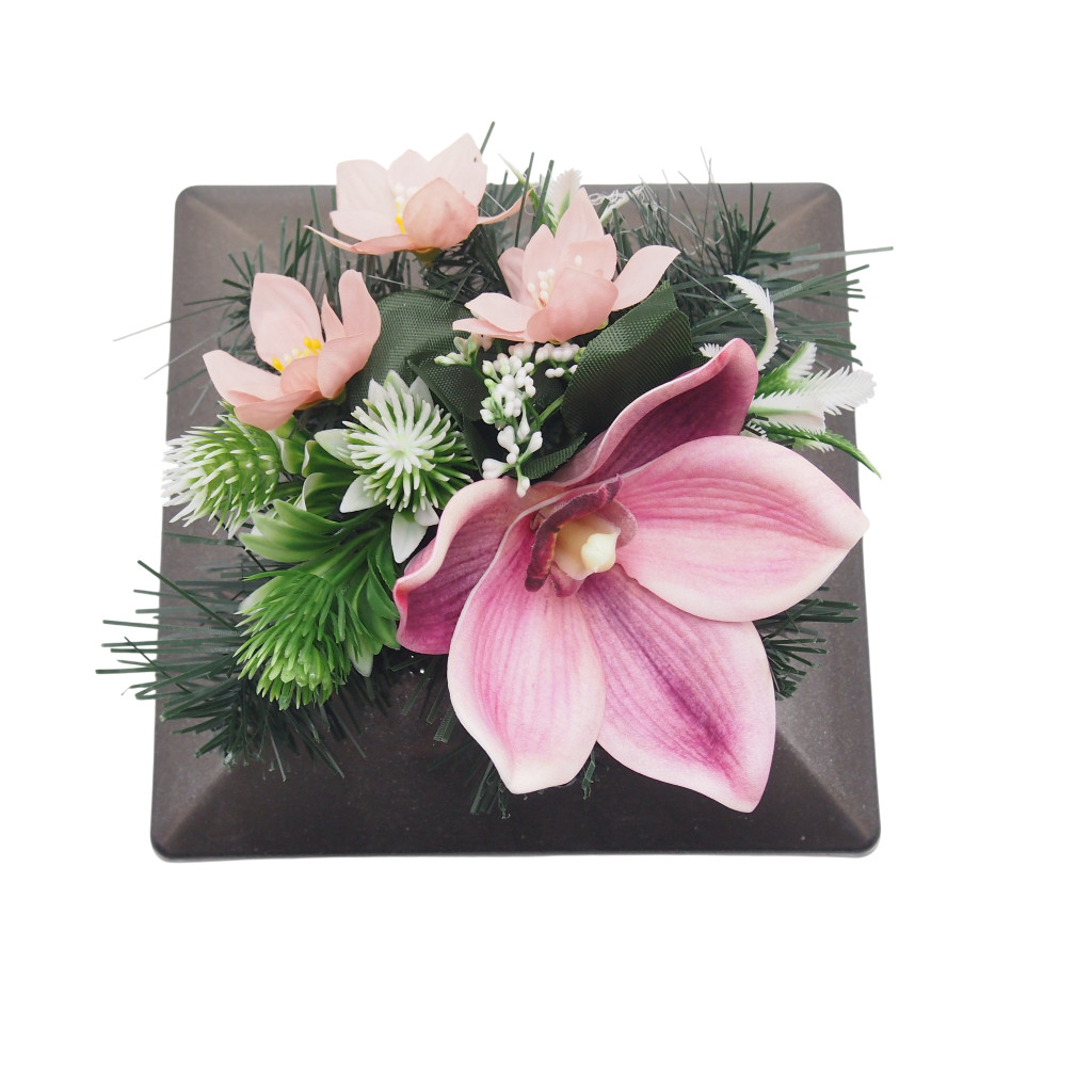 Selyemvirágok ragasztva, alatta beton nehezéknek, mű tálban.