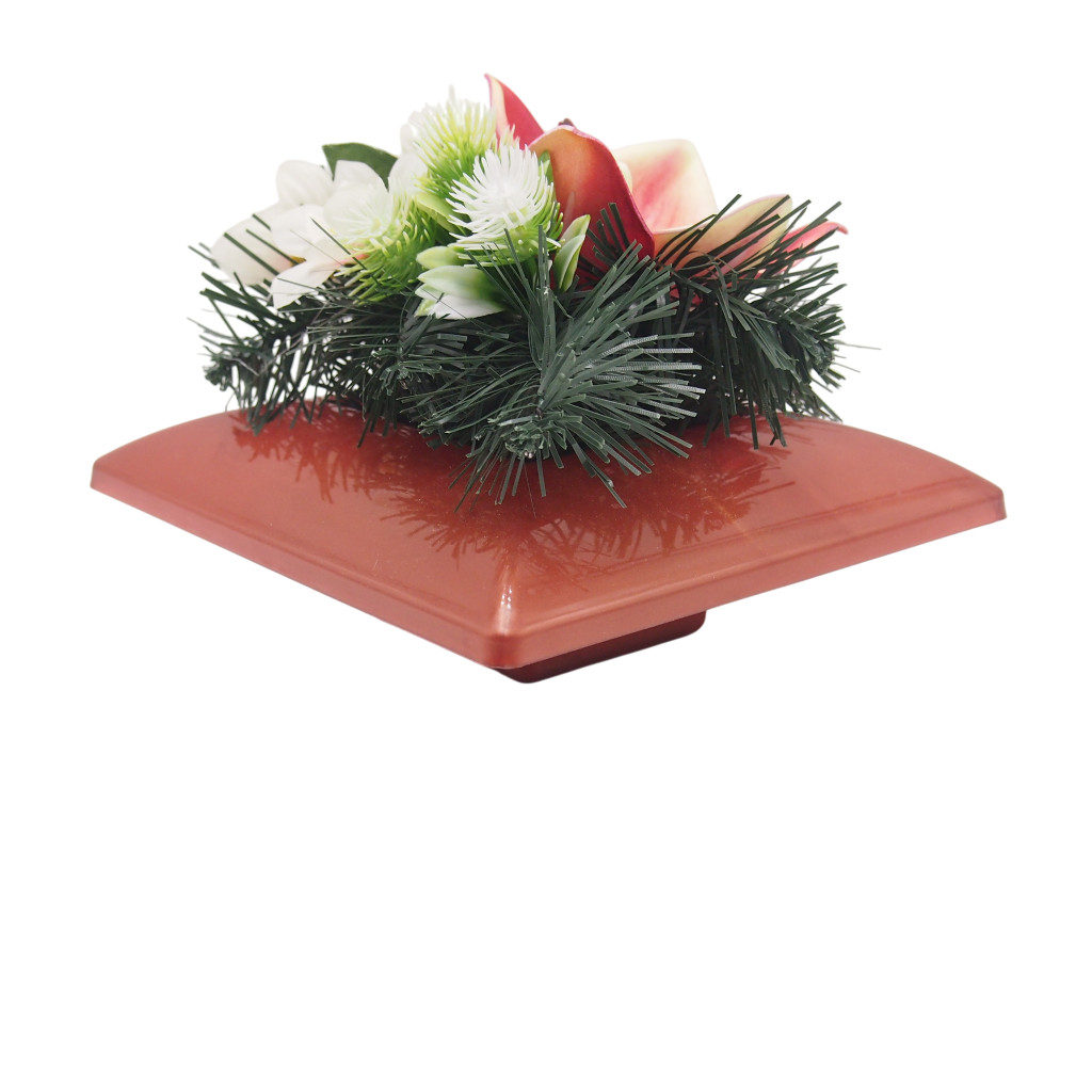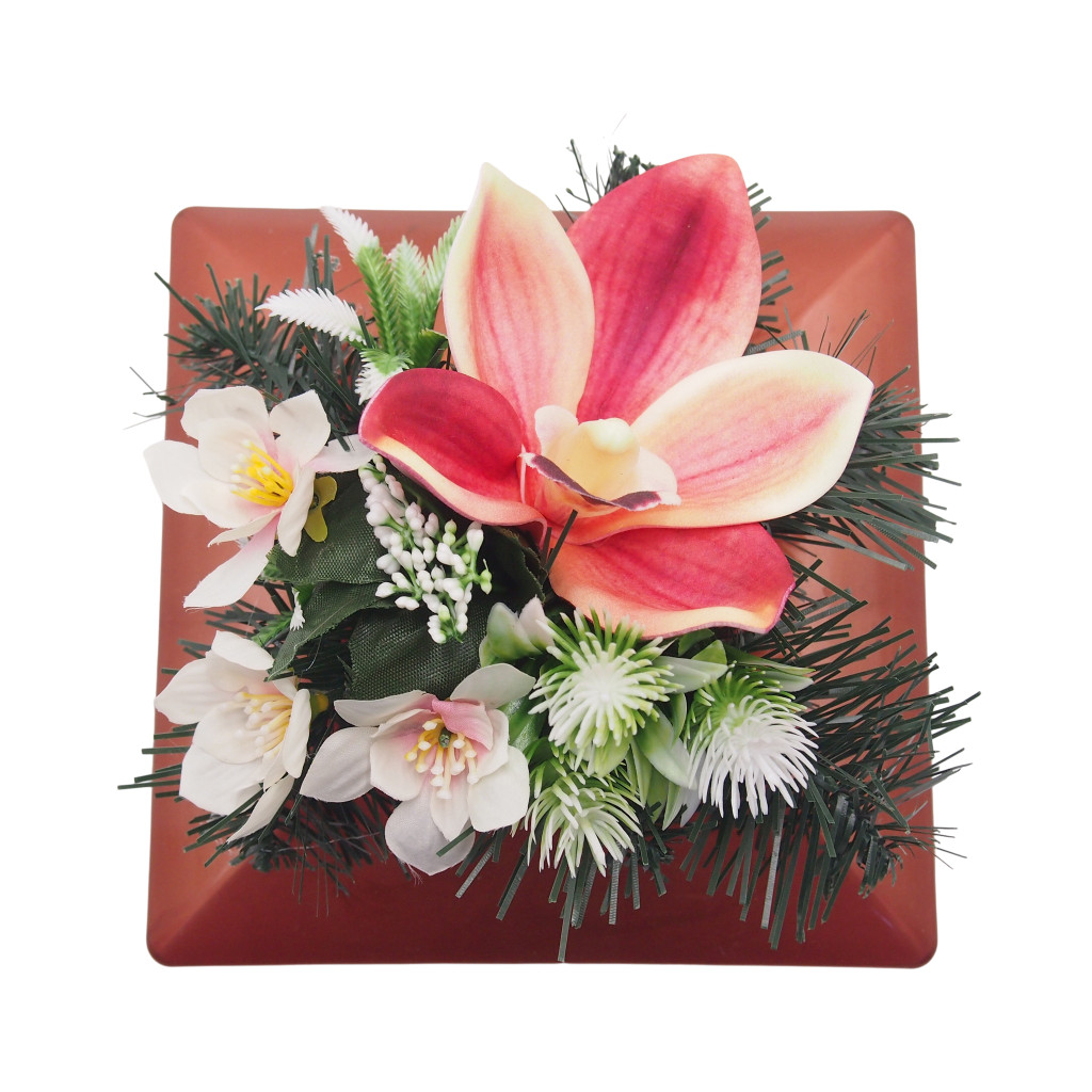 Selyemvirágok ragasztva, alatta beton nehezéknek, mű tálban.