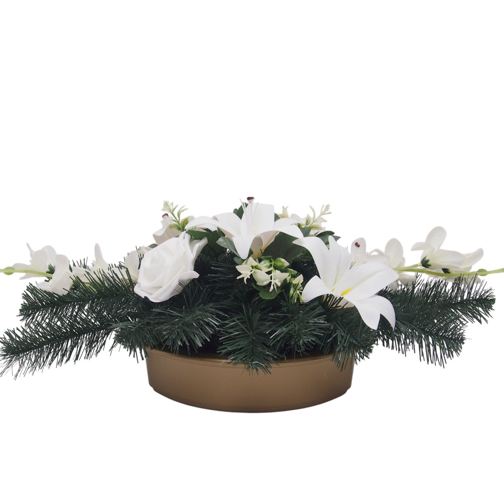 Selyemvirágok száraz oázisba tűzdelve, alatta beton nehezéknek, mű tálban.