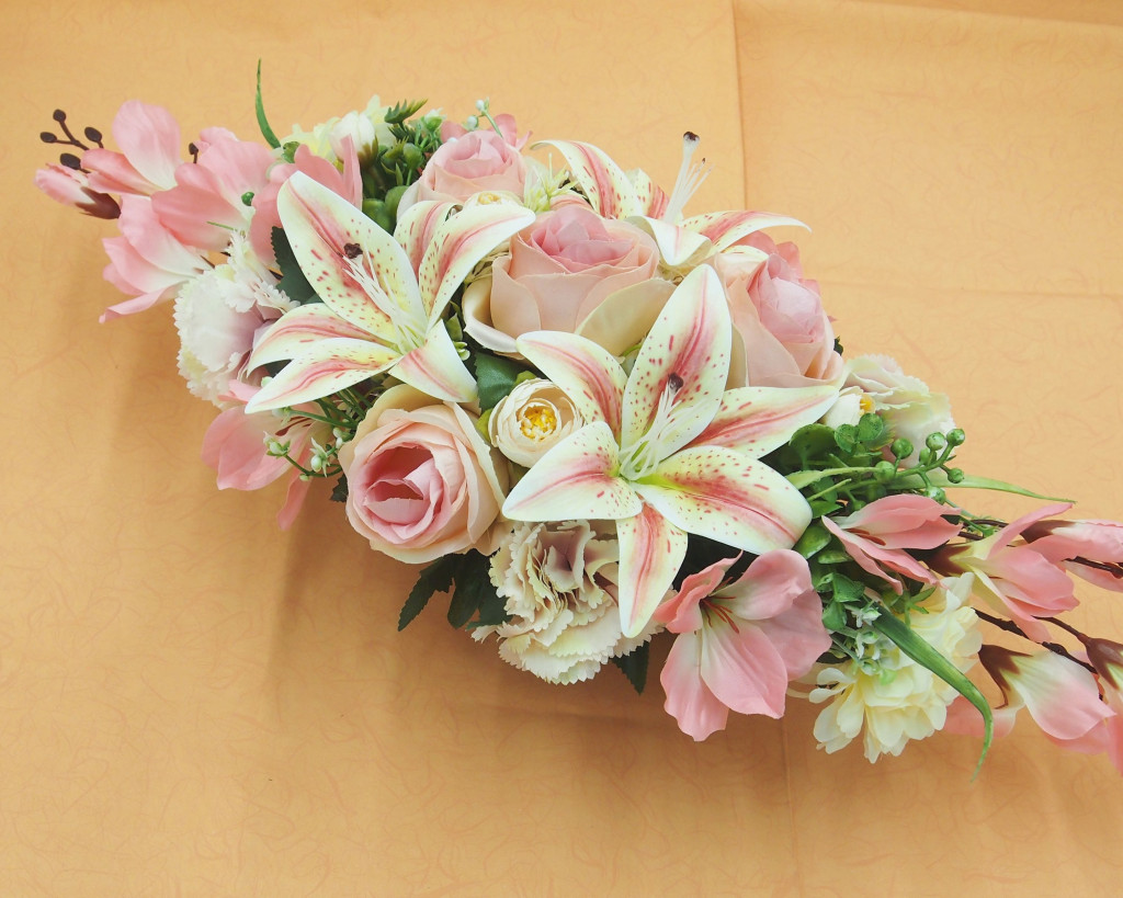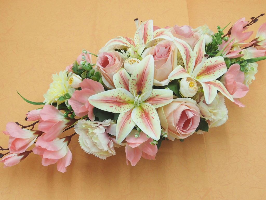 Selyemvirágok száraz oázisba tűzdelve, alatta beton nehezéknek, mű tálban.
