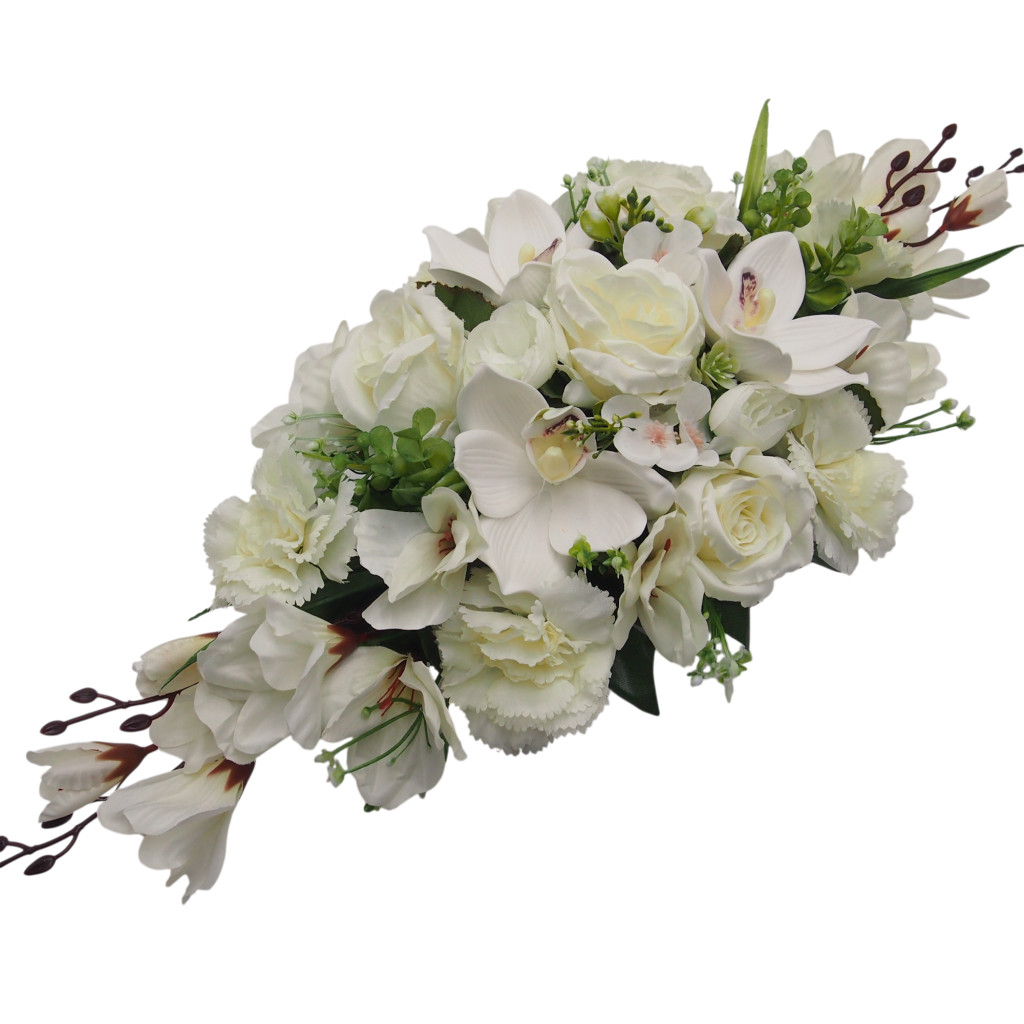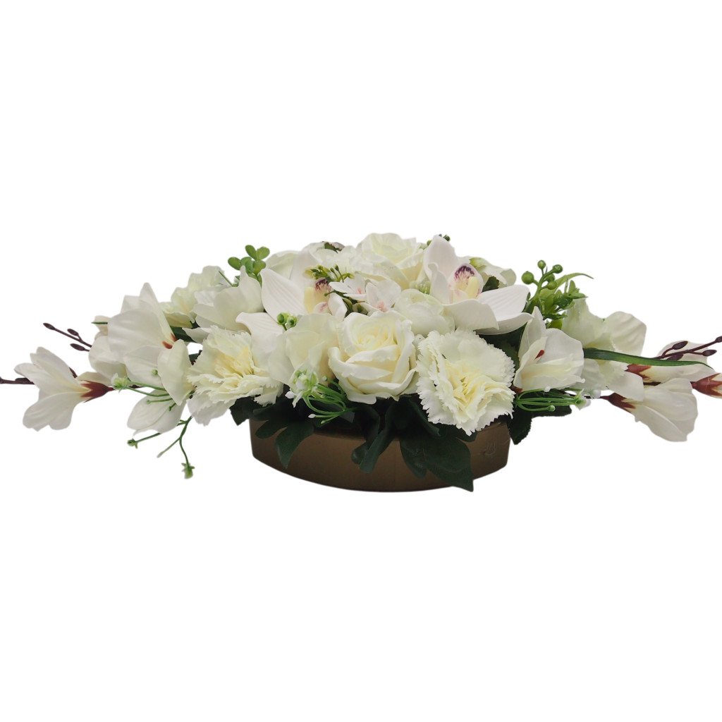 Selyemvirágok száraz oázisba tűzdelve, alatta beton nehezéknek, mű tálban.