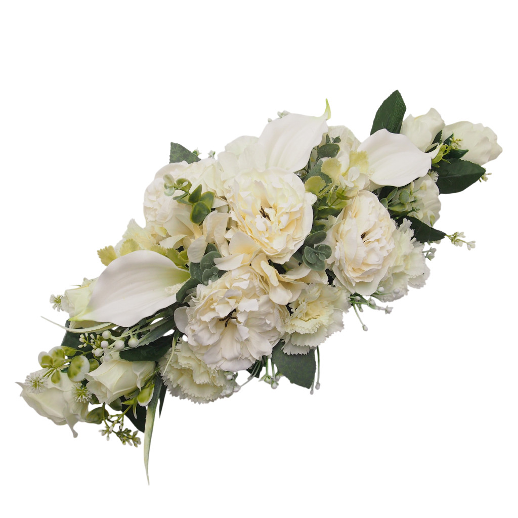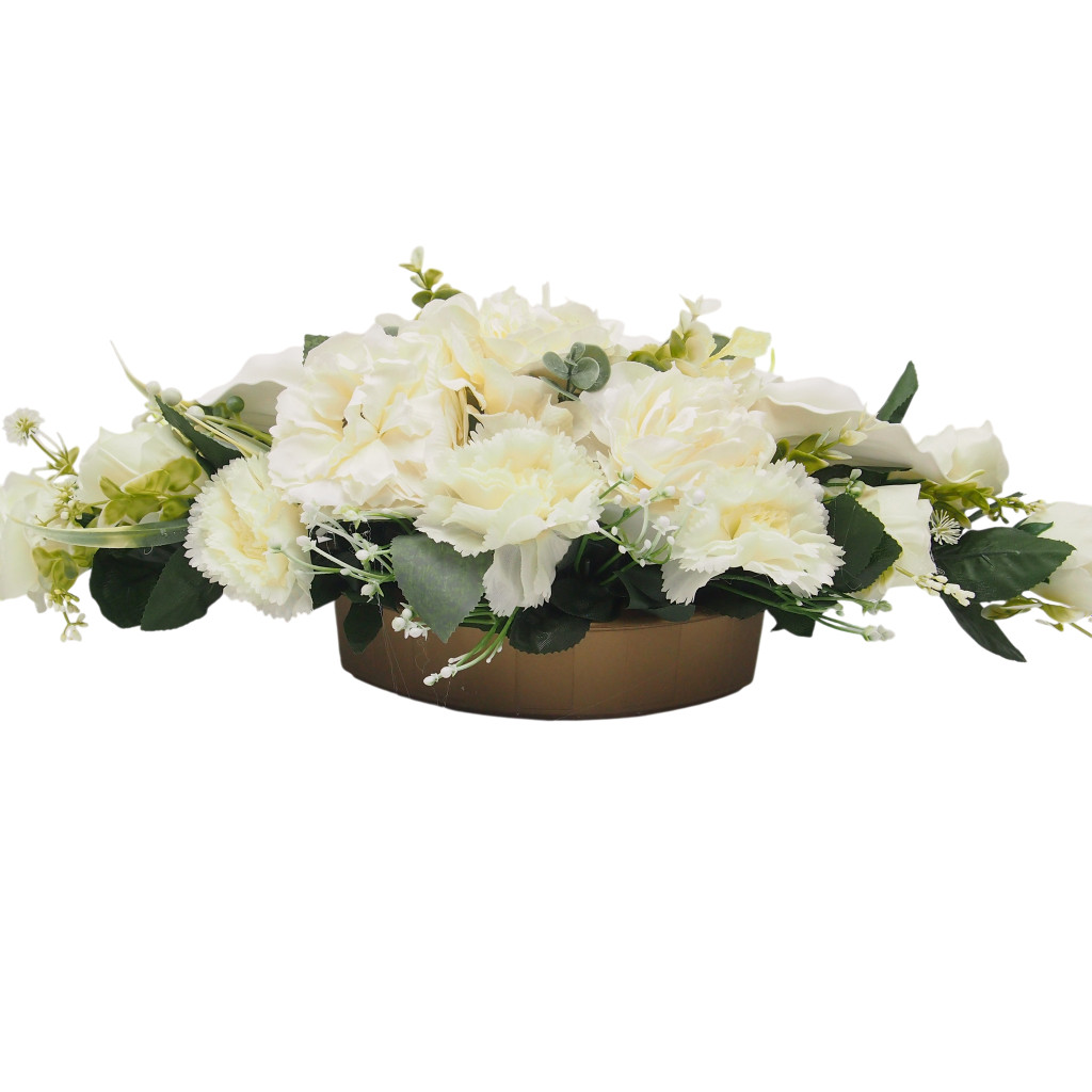 Selyemvirágok száraz oázisba tűzdelve, alatta beton nehezéknek, mű tálban.