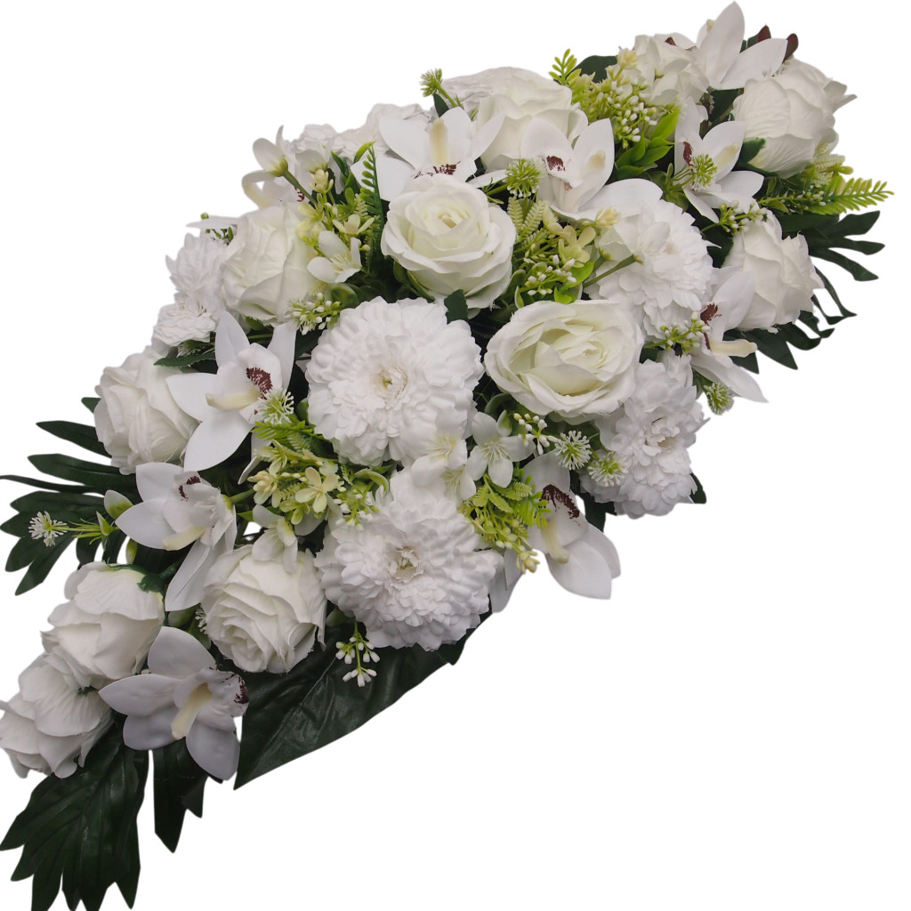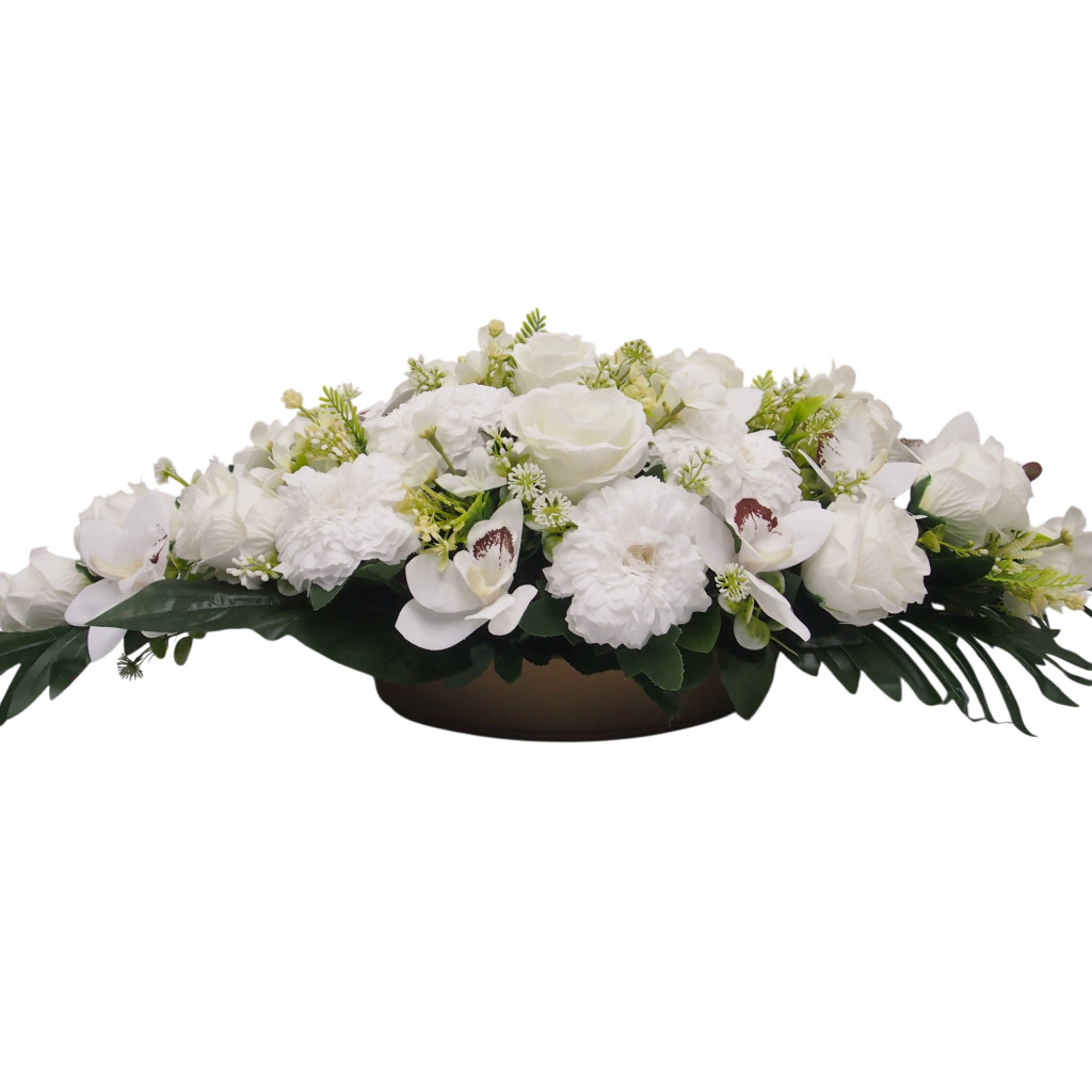 Selyemvirágok száraz oázisba tűzdelve, alatta apró murva nehezéknek, mű tálban.