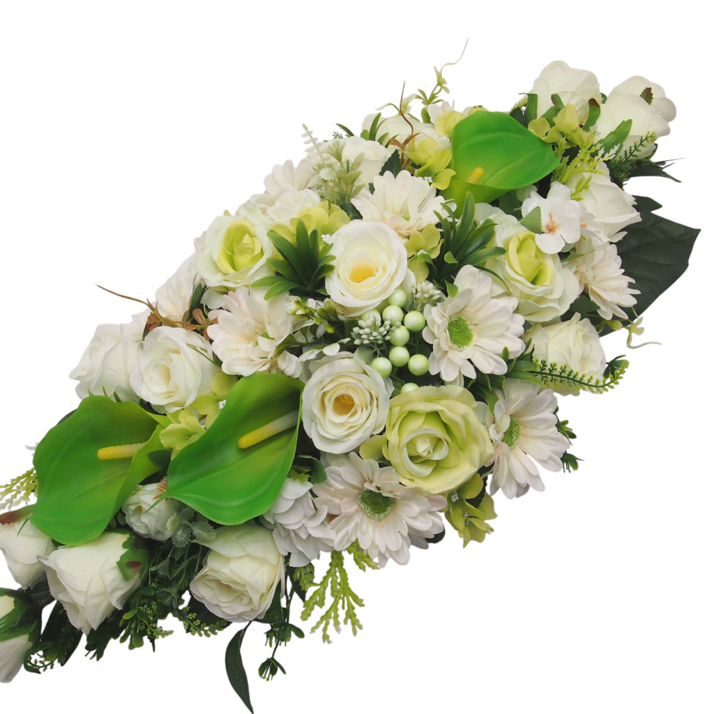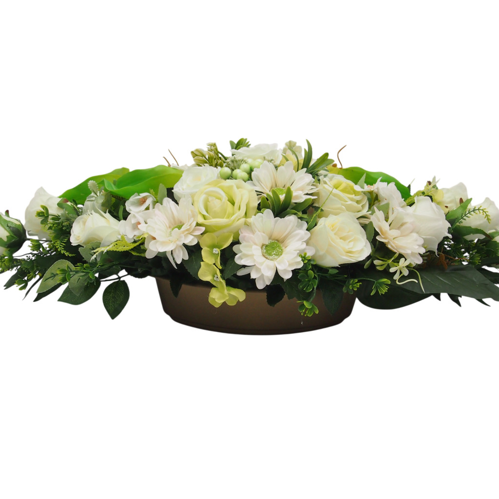 Selyemvirágok száraz oázisba tűzdelve, alatta apró murva nehezéknek, mű tálban.