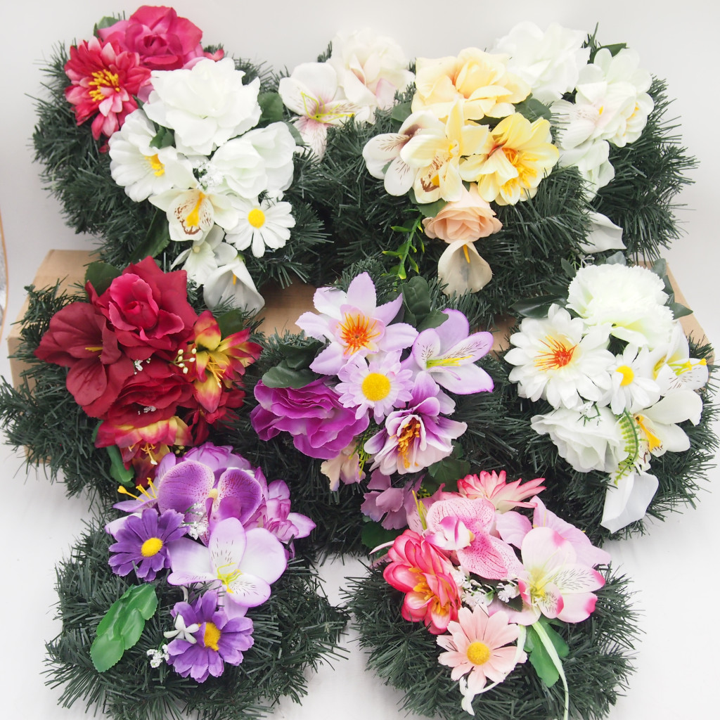 Selyem görög alapon vegyes selyemvirág díszítés. Az ár a képen látható 10db koszorút tartalmazza. A szettek fixek, nincs mód színbeli vagy mennyiségbeli változtatásra. A koszorúk átmérője körülbelül 20cm.