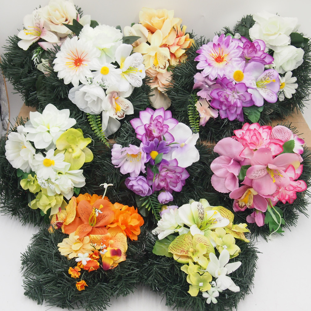 Selyem görög alapon vegyes selyemvirág díszítés. Az ár a képen látható 10db koszorút tartalmazza. A szettek fixek, nincs mód színbeli vagy mennyiségbeli változtatásra. A koszorúk átmérője körülbelül 20cm.
