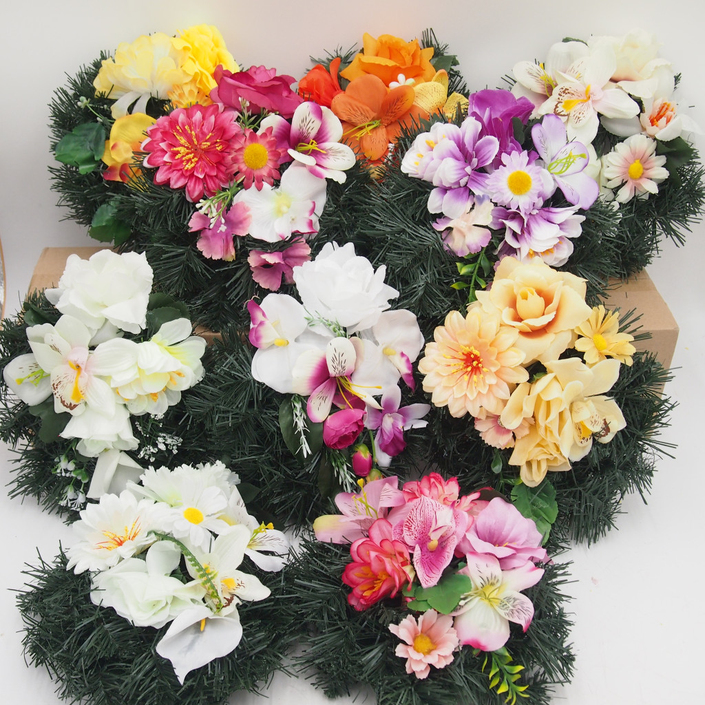 Selyem görög alapon vegyes selyemvirág díszítés. Az ár a képen látható 10db koszorút tartalmazza. A szettek fixek, nincs mód színbeli vagy mennyiségbeli változtatásra. A koszorúk átmérője körülbelül 20cm.