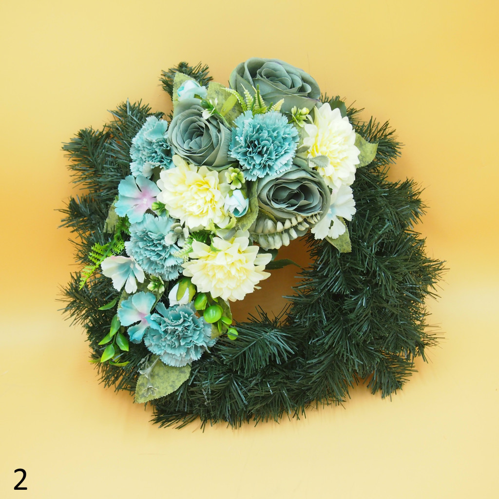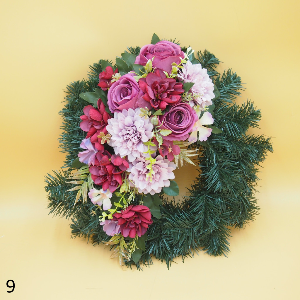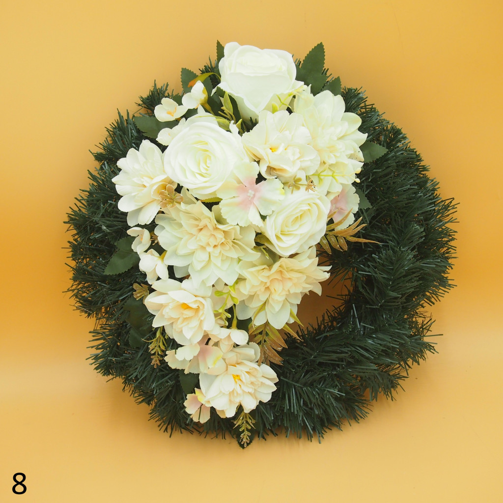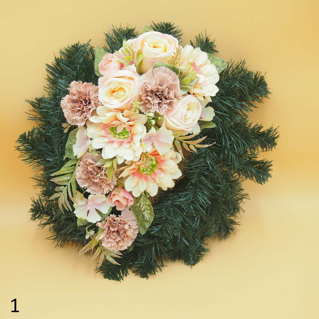 Selyem görög alapon vegyes selyemvirág díszítés.