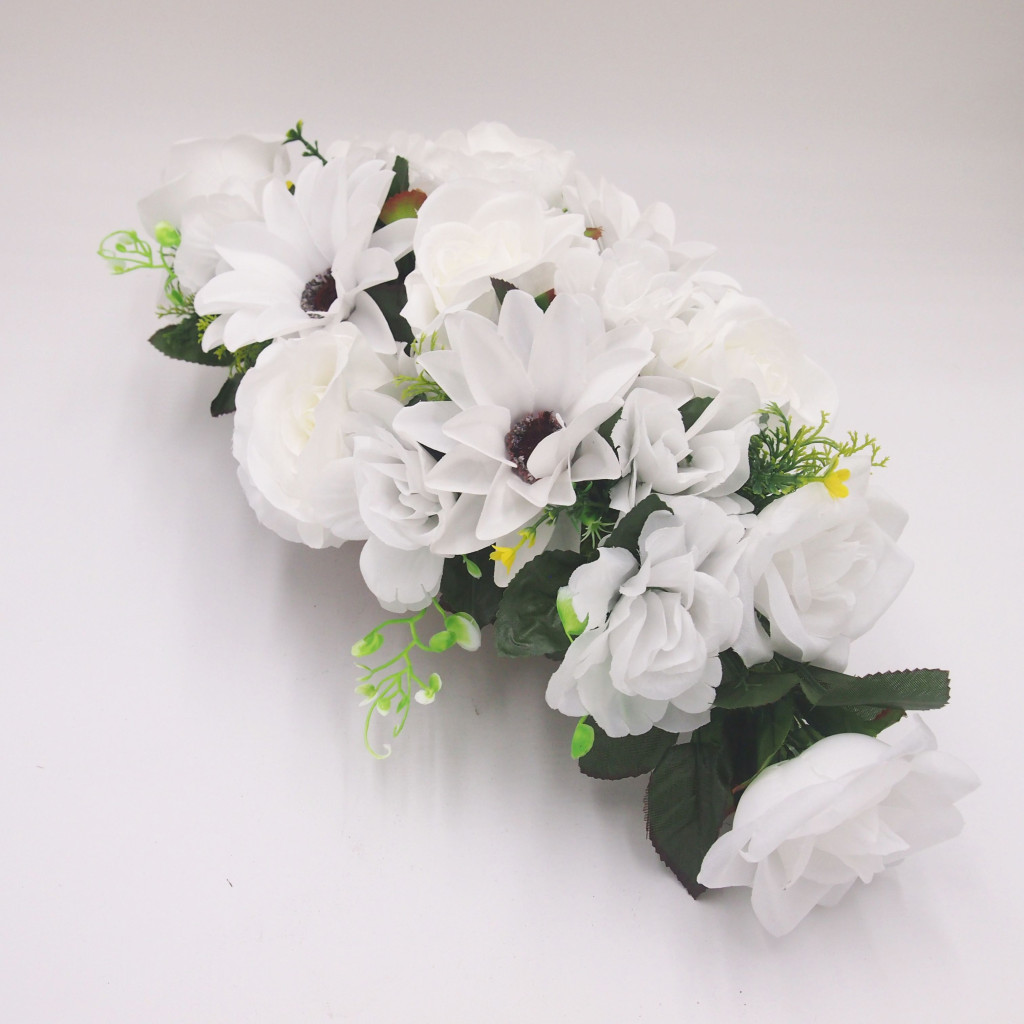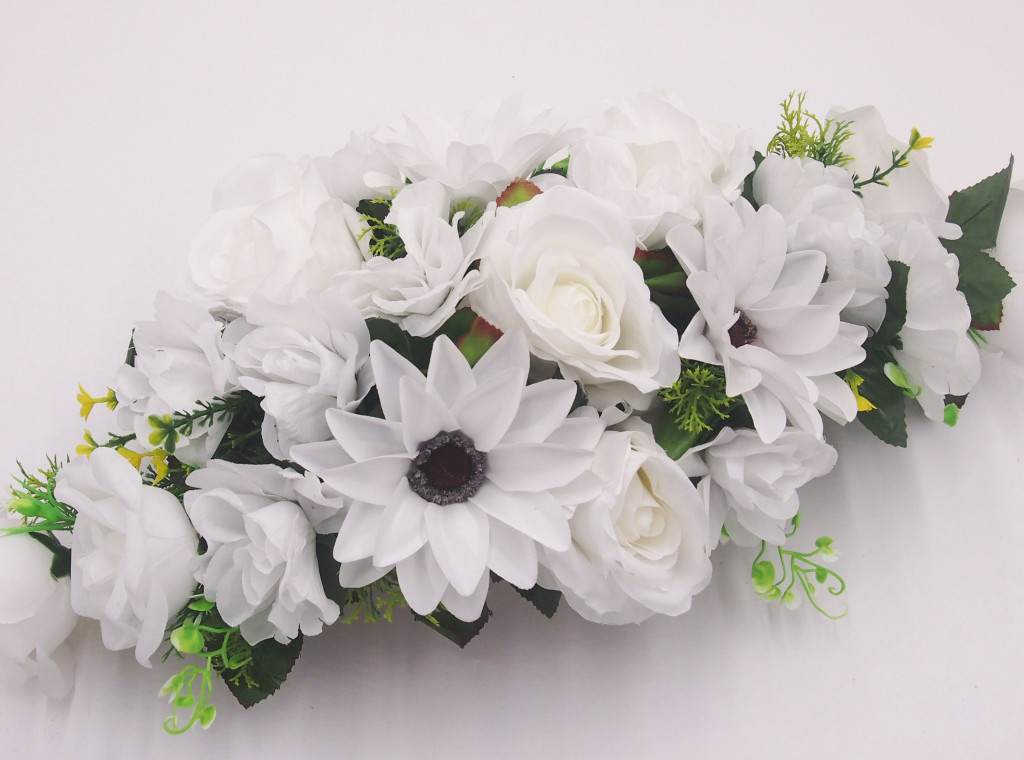 Selyemvirágok száraz oázisba tűzdelve, alatta apró murva nehezéknek, mű tálban.