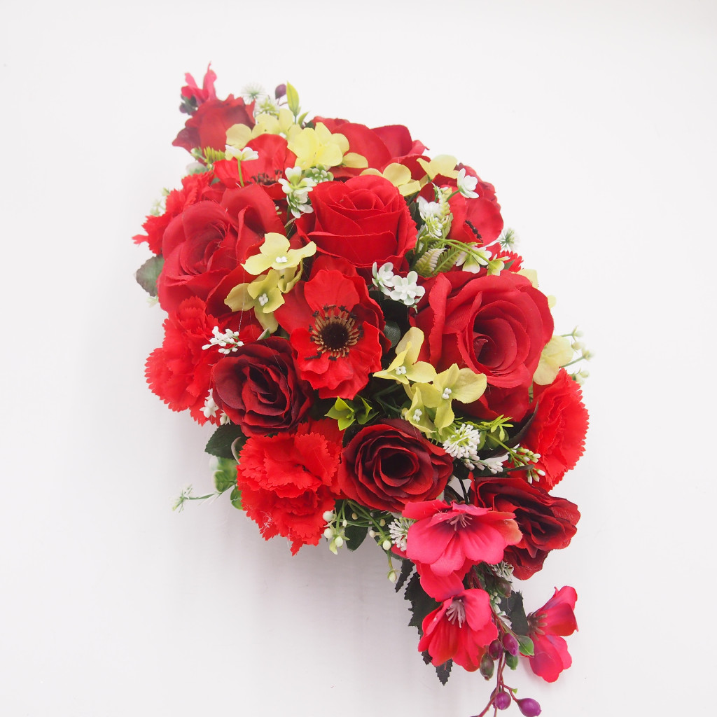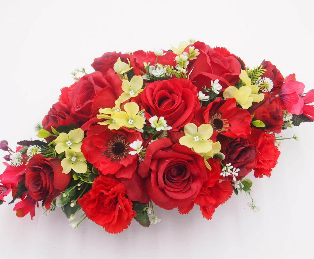Selyemvirágok száraz oázisba tűzdelve, alatta apró murva nehezéknek, mű tálban.