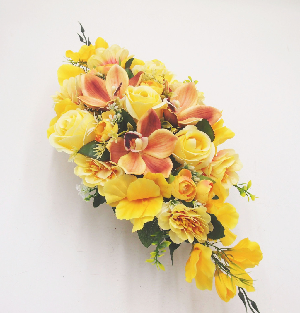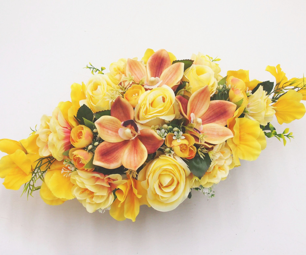 Selyemvirágok száraz oázisba tűzdelve, alatta apró murva nehezéknek, mű tálban.