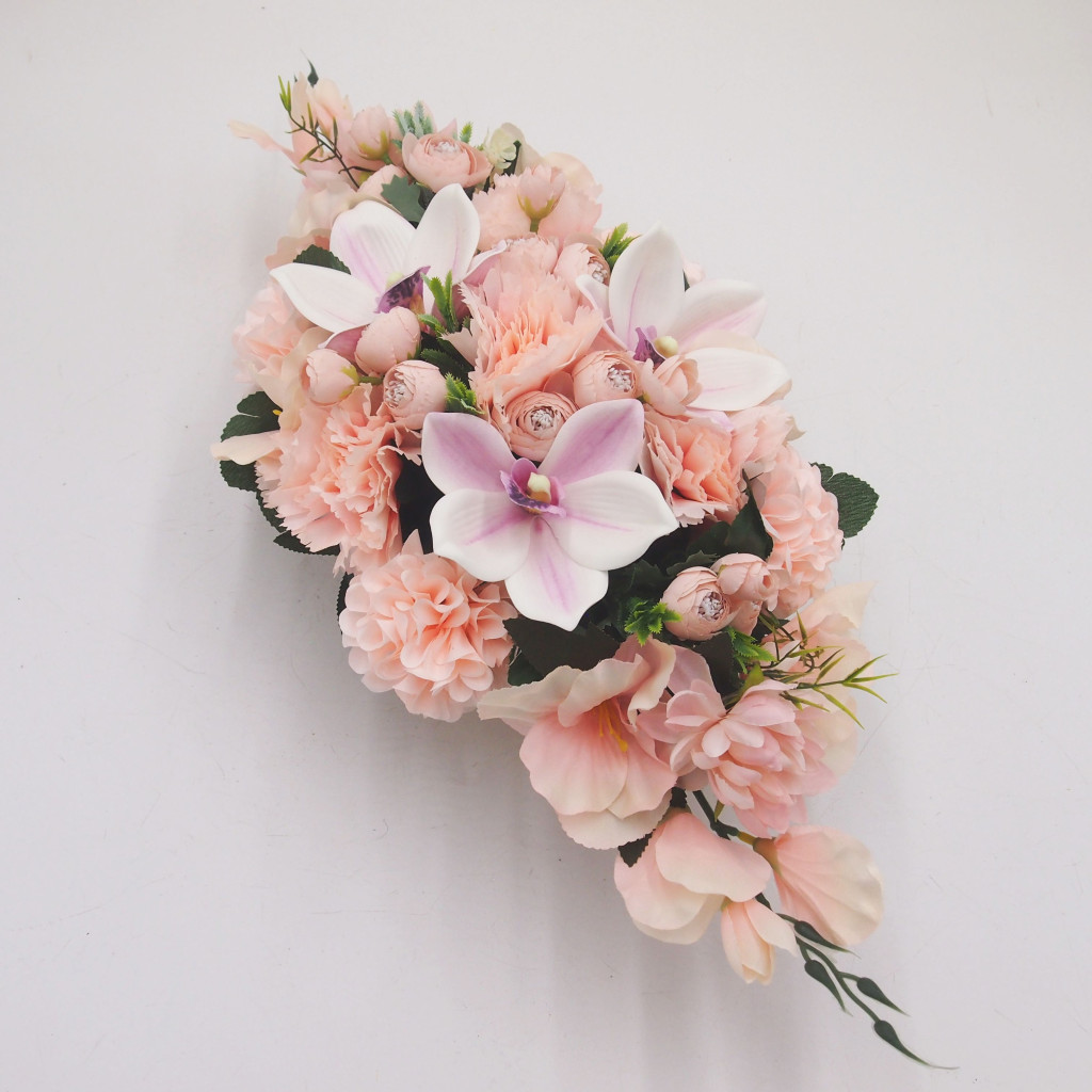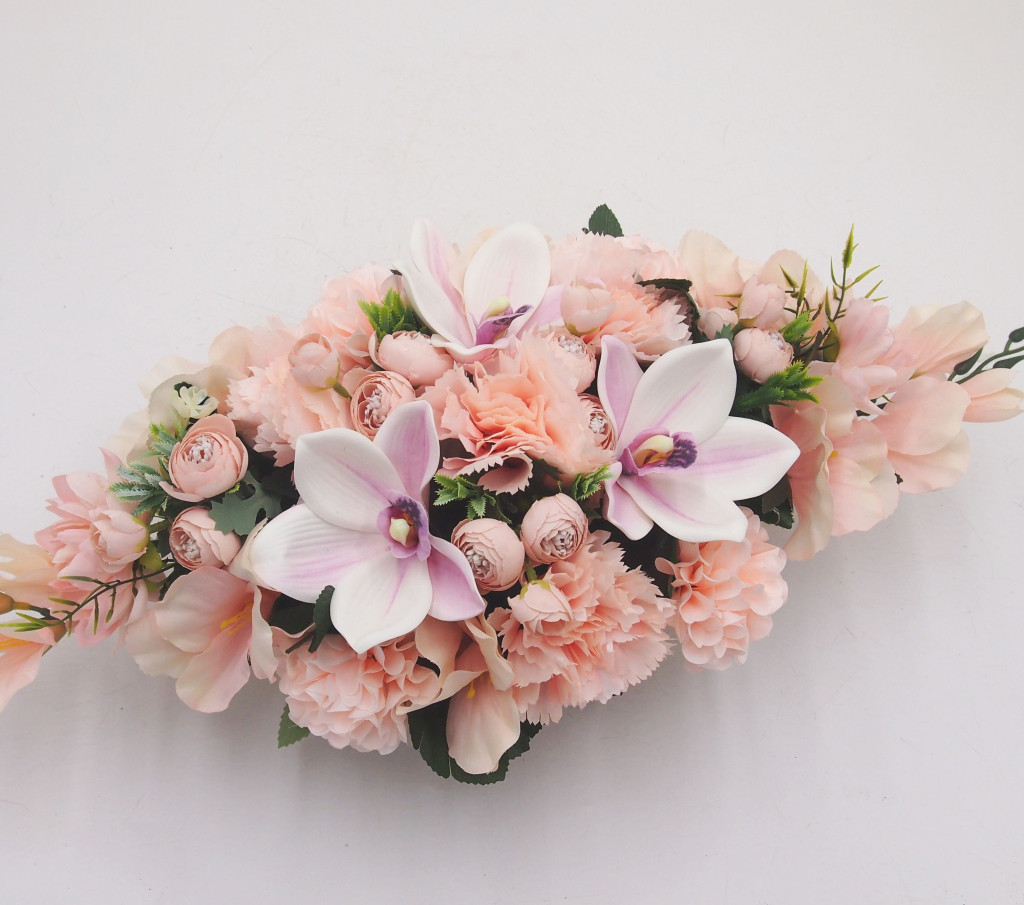 Selyemvirágok száraz oázisba tűzdelve, alatta apró murva nehezéknek, mű tálban.