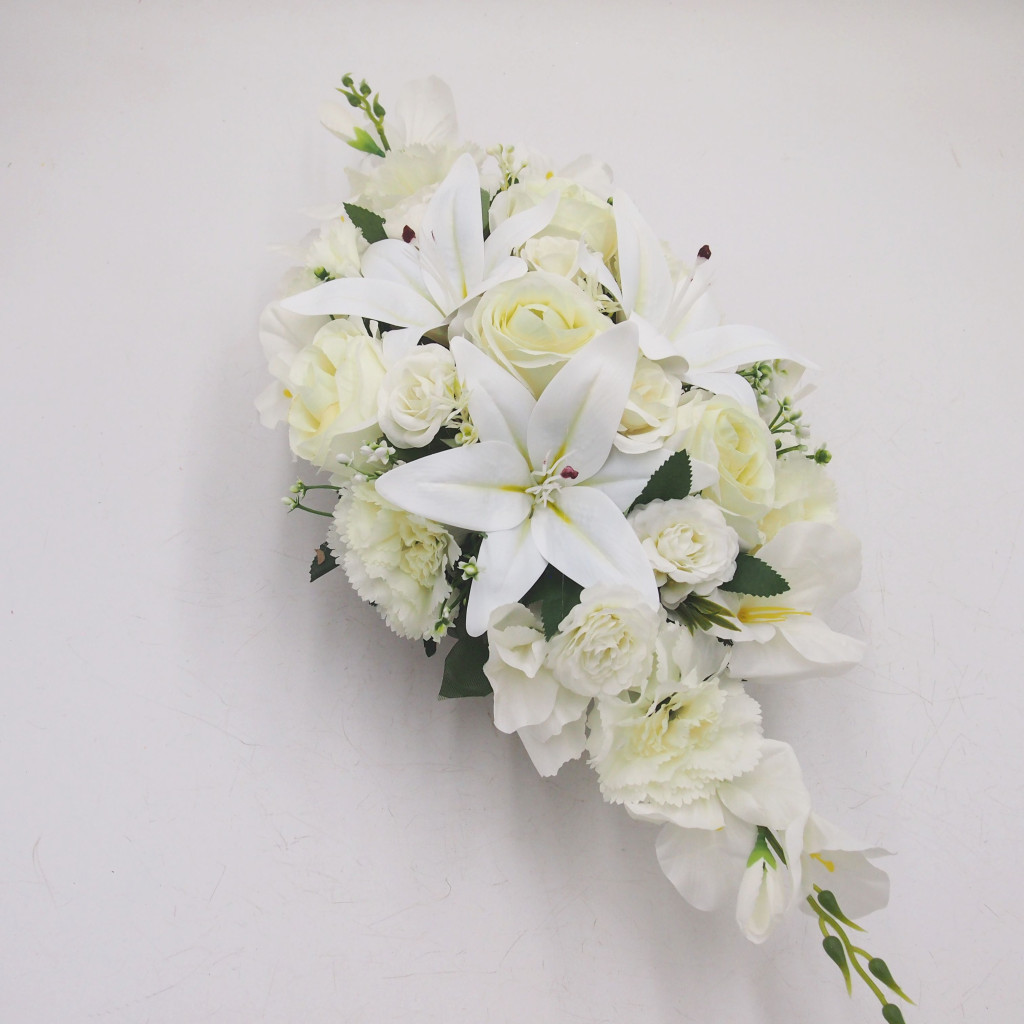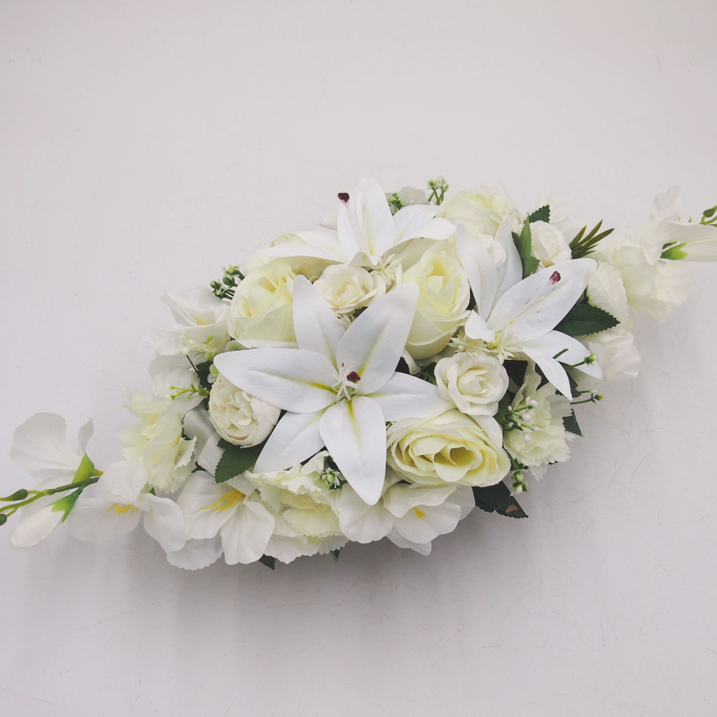 Selyemvirágok száraz oázisba tűzdelve, alatta apró murva nehezéknek, mű tálban.