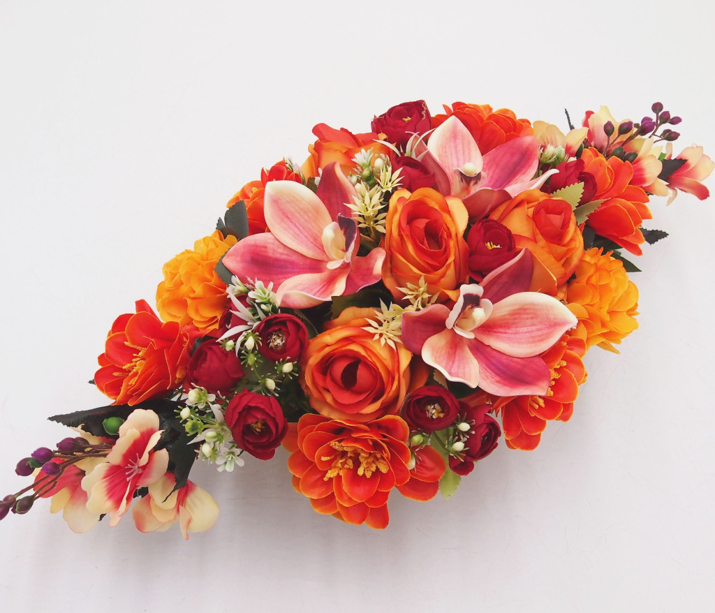 Selyemvirágok száraz oázisba tűzdelve, alatta apró murva nehezéknek, mű tálban.