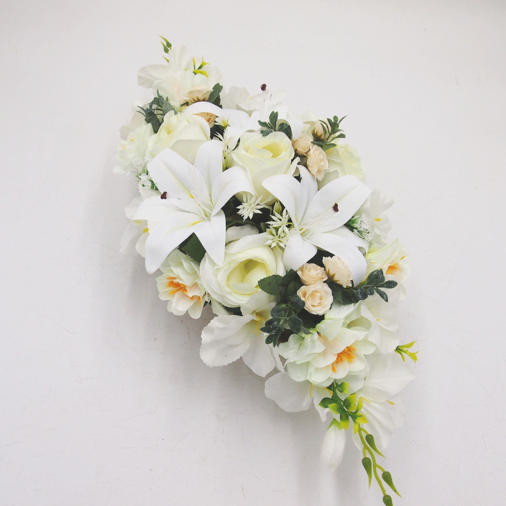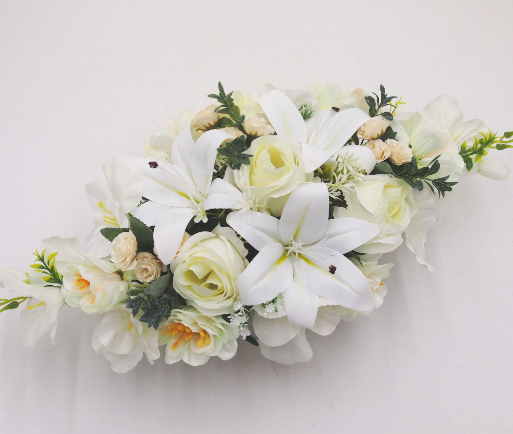 Selyemvirágok száraz oázisba tűzdelve, alatta apró murva nehezéknek, mű tálban.