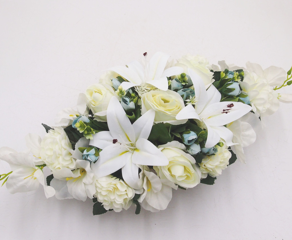 Selyemvirágok száraz oázisba tűzdelve, alatta apró murva nehezéknek, mű tálban.