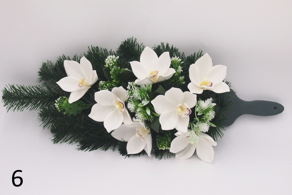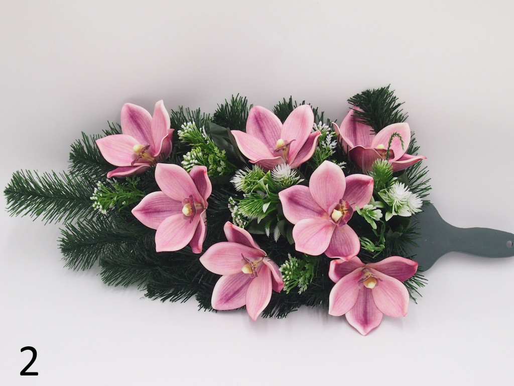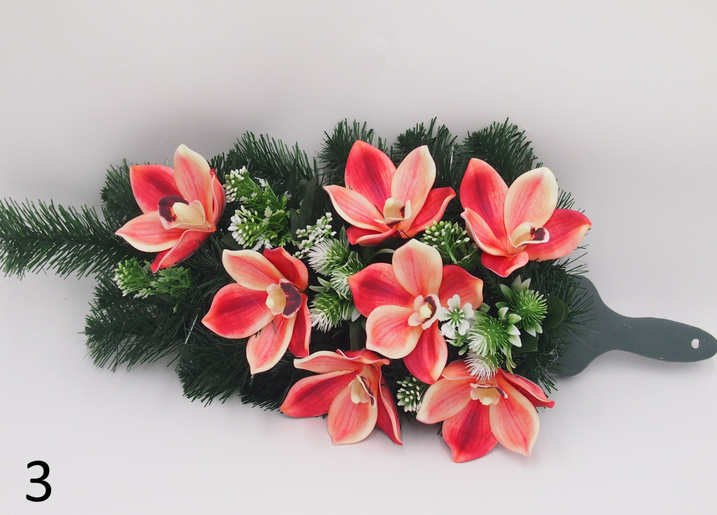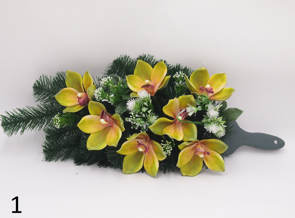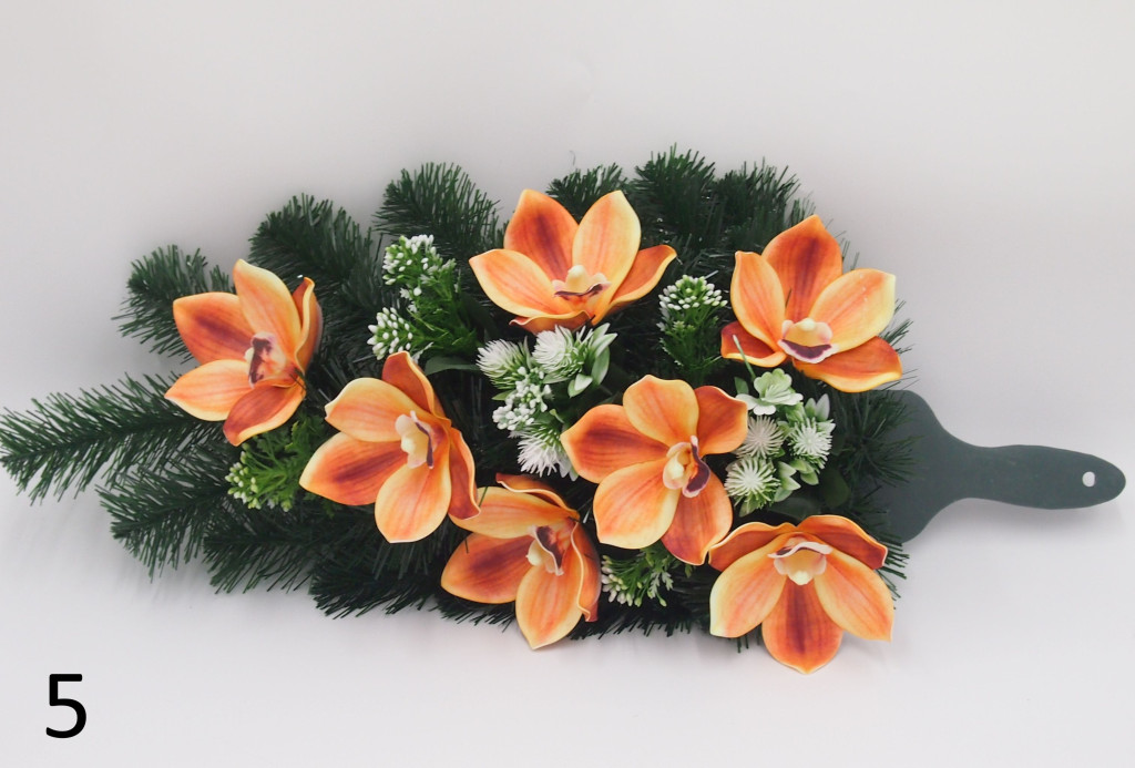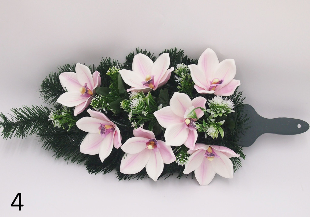 Selyem műanyag talpas sírcsokor alapon hab/polifoam orchidea díszítés. Kb. 60cm hosszú a fogható műanyag végével együtt.